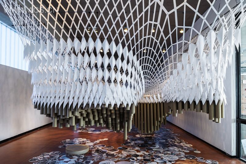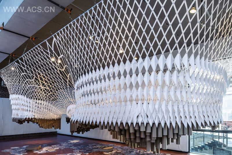 悬挂装置是由定义切割激光切割的聚酯薄膜板组成,表面作为一个整体,只能由模型平台的重量形成张力实现其最终形状。仅重9千克的平面悬挂着超过226千克的平台。平面的底部由订制的高密度聚乙烯合成纸板覆盖,以隐藏模型。这便激励游客去探索装置的全部,去全面参与。室内的体验对游客来说不仅是惊喜,还提供了独特的方式以审视学生在独立而连续的环境中的实际成果。