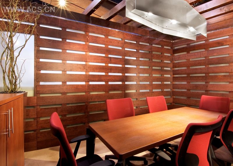 下面,接待区欢迎游客。一个圆形的铜质接待台与丙烯酸交易表面锚定在L形宴会座位覆盖橙色垫子。在左边,一系列由抛光不锈钢面板包裹的线性办公室引领着眼睛从接待区向下一个短的大厅,到达远处的会话休息区。接待处后面是主会议室,其墙壁覆盖着一系列水平樱桃木带,交替出现半透明磨砂白色丙烯酸薄水平带。头顶,一系列突出的木椽跨越会议室和接待区。椽子的锥形末端支撑着铝制标牌和灯具电枢,具有公司名称和标识。