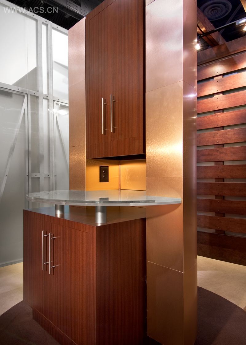 总部位于佐治亚州罗斯威尔的Lorenc + Yoo设计公司设计为一个令人兴奋和迷人的空间,采用了独特的美国西方衍生的视觉语言,多种材料,丰富的暖色调和大胆的现代形式,创造了一个欢迎游客进入的展览。精致的室内环境,传达工艺和兴奋。例如,在展览的入口门槛处,悬臂式跷跷板形状的人造锈钢楔形梁在头顶上突出,并支撑着公司的名称,由厚尺寸字母组成。这个四英尺宽的横梁由典型的原始建筑构件,横梁和圆形管道组成。