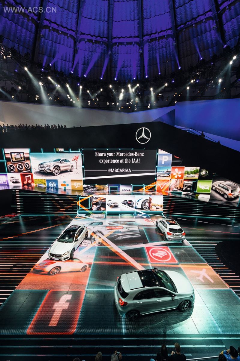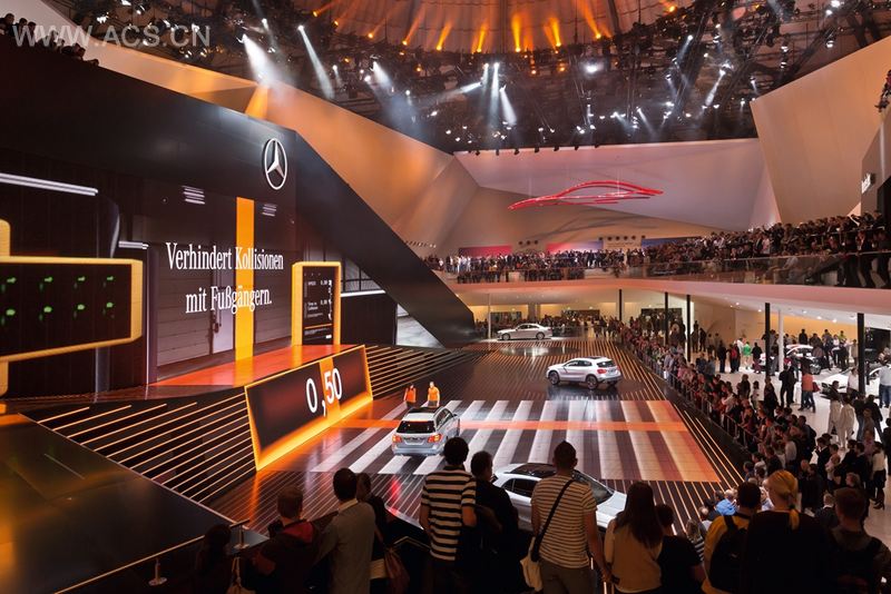 展览建筑建在会展馆内,其身轻盈,高三层楼。内部如黑珍珠一样闪亮,并设有“马术场”——由媒体设施组成的舞台,从不同方向、不同高度都能观赏。引导游览的舞台演出式手法让情感与信息在同一个空间里相互交织。车辆在13个车道的舞台上表演,同时配上媒体效果,游客可以在安静的展览环境中感受当前的品牌主题。