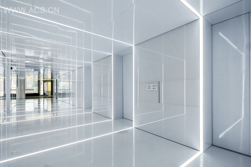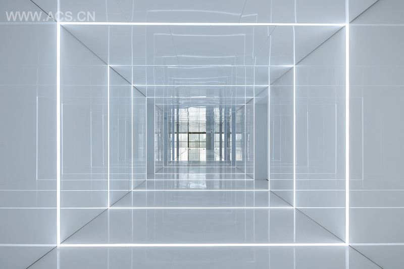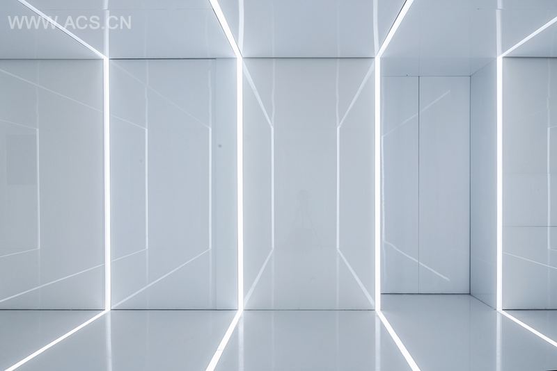 薄天花板让模型更加引人注目。灯光和墙面反映了整个空间,甚至被半透明的玻璃扩散。空间的某些地面由人造石和地毯构成,为这个反射及无线延展的空间提供了静态的时空。