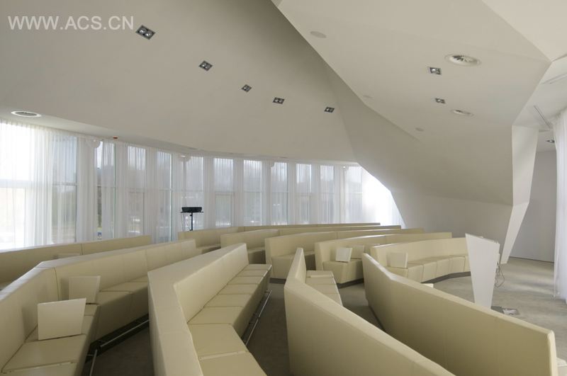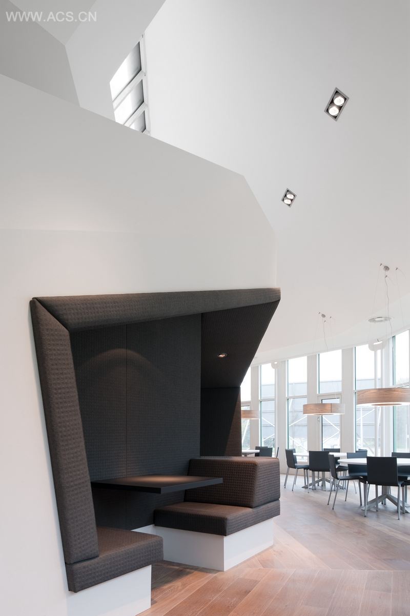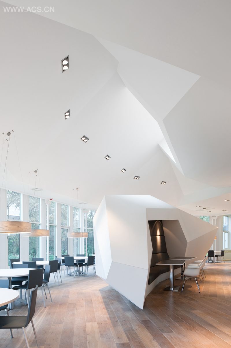 一楼的餐厅也以一种沉着的物化为特色,白灰色调,配上暖色的橡木地板,让空间更加完美。餐厅的中央是雕塑型休息沙发,其设计与移动的天花板相呼应,沙发完全根据3D计算机模型打造。在之前翻修中原来关闭的天窗被重新打开,给餐厅提供了充足的光线,营造出欢快的氛围。