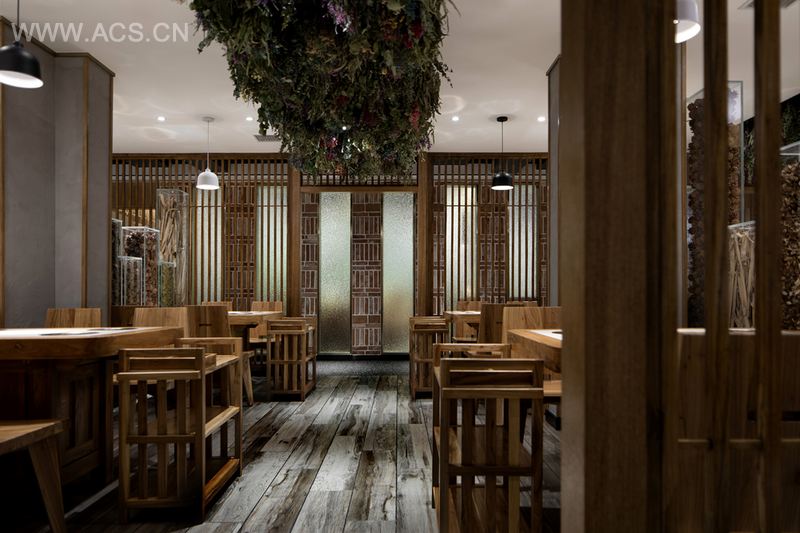 空间材质上采用原木,松果、莲蓬、竹叶、薰衣草、干枝、