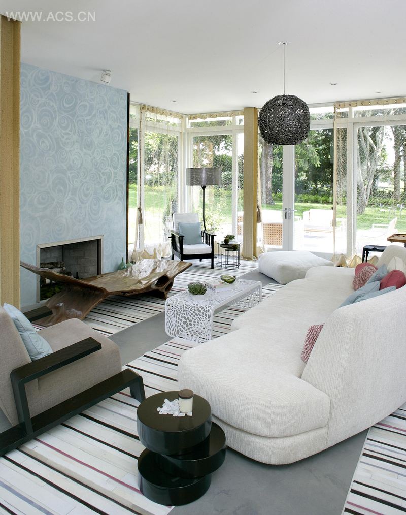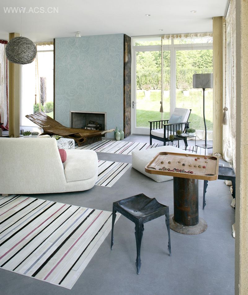 2008HC&G绿色创意家庭房的完美创造结合了环保的现代家具与现成艺术品,其中一个巧妙的例子由几百个半边硬币和金属框架焊接制成的“硬币椅子”。壁炉采用海洋主题装饰,威尼斯石灰围绕生锈的废金属片制作而成的壁炉架,定制的沙发上布置了中性色调的有机竹纺织软垫吸引人前来触摸,而结构柱被来自海滩的沙子和云母混合物覆盖。设计师用重新定义的现代家庭居室,取代了传统壁炉周围的席位安排,使其成为一个可以适应日常生活的温馨家庭。