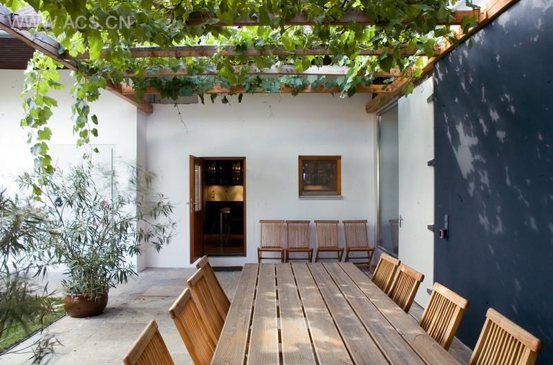 埃里希·萨特勒酒窖位于塔滕村,是一个典型的匈牙利边境的奥地利葡萄酒产区村落。该葡萄酒厂位于两个现有的两栋建筑物之间。靠近村子中心的是一个现寸的L形的住宅,有一个庭院和人行道。顺着葡萄园的方向看去,另一端是生产和储存设施的进线口。中间是一栋新的建筑,有两道防火墙限制,在地面层作为桶房,而一楼设有带厨房的品酒室、办公室和客房。一楼的室内东西面各有一个阳台,两道长长的玻璃幕墙使内外部空气流通。从屋顶露台俯瞰村庄,可以看到葡萄园周边360 °全景,包括附近的湖泊和阿尔卑斯山山麓。