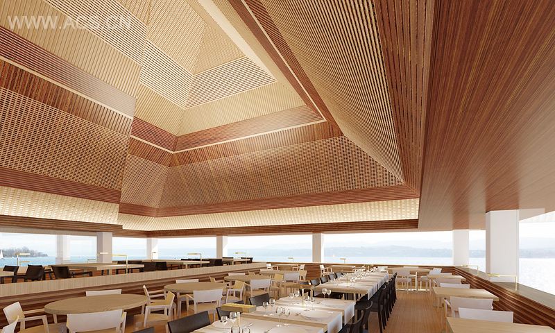 这个空间项目采用了这样的一种构思方案:即使在室内的人们也能感受到屋顶的丰富维度。这个方案遵循了空间的需求,带型窗上的垂直横梁让整个空间免去了拉伸的构造方式。与此同时,这些横梁富有空间感地框住了带型窗,透过窗户能看到苏黎世湖的水平全景画面,这就有点像是赛尔乔·莱翁内式的西部片场景。木质天花板上的精工图案升华了整个屋顶的空间效果,与此同时,还将空间的方位朝向了水面。