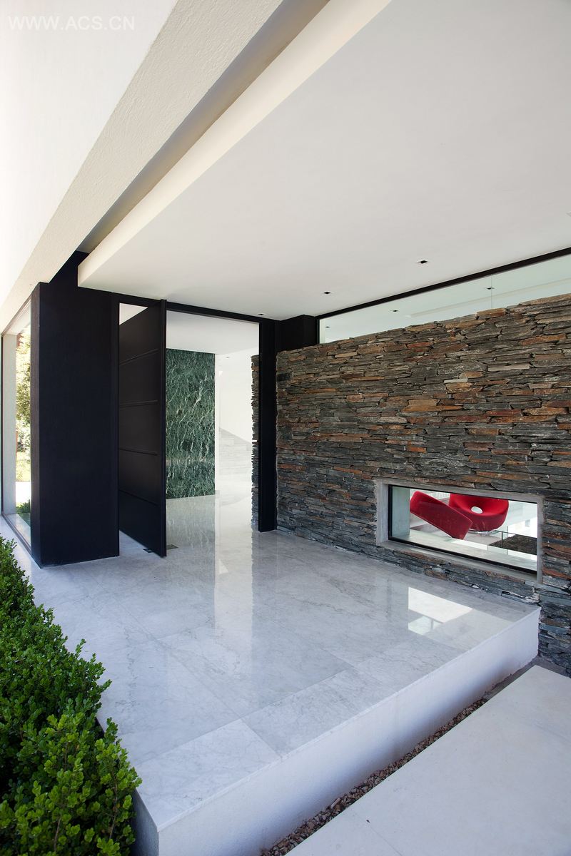 一个隐蔽而令人回味的入口使得房子有了更鲜明的形象。白色的卡拉拉大理岩装饰了内部建筑,白色的墙面和天花板,使房子仿若置身于水中。