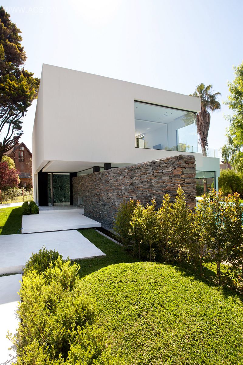 该项目位于布宜诺斯艾利斯市皮拉尔区,一处不规则地块的背后,顺着街道的方向。顺着砖石垒建的围墙可以找到房子的入口,该围墙区分并定义了入口到居住区的内、外部,并与房子内部大面积的纯白装饰形成了对比。