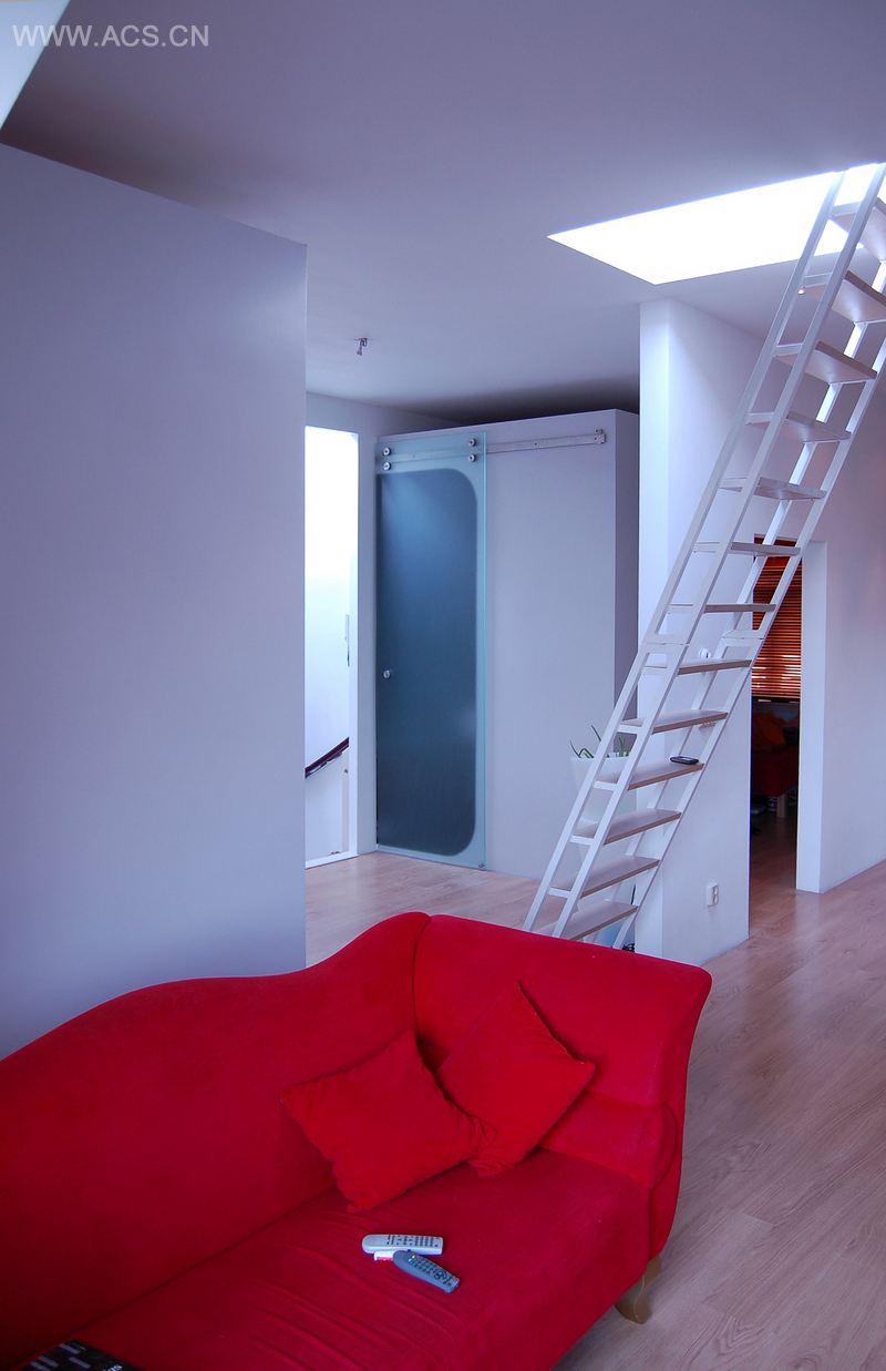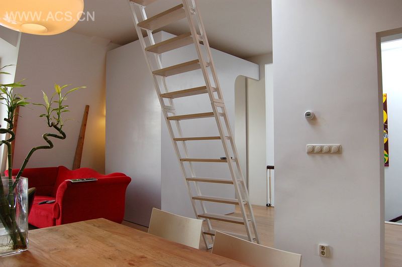 这间位于阿姆斯特丹的阁楼被设计成一个开放式空间,通过安置板块和空间元素,阁楼的各功能区在没有围墙、门和走廊的情况下被明确分隔开。这些元素形成独特的空间,人们可以沿着阁楼内仅剩的一面墙穿过房子,阁楼内有一条通往屋顶露台的楼梯,一个很大的混凝土厨房和两个“木箱”。其中一个“木箱”有一个单独的小房间,可以作为育婴室或书房,另外一个则包含浴室和厕所。在有必要的时候,浴室和休息区还有一个玻璃推拉门可以很好地维护个人隐私。两个“木箱”使用橡胶与地板和既有的墙粘合,并且可以在不对原来空间造成任何损害的情况下清除。