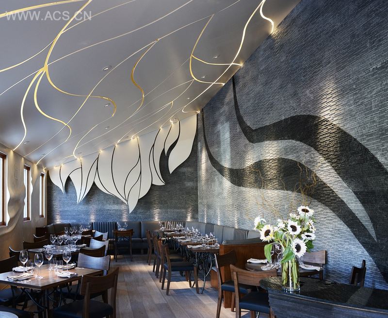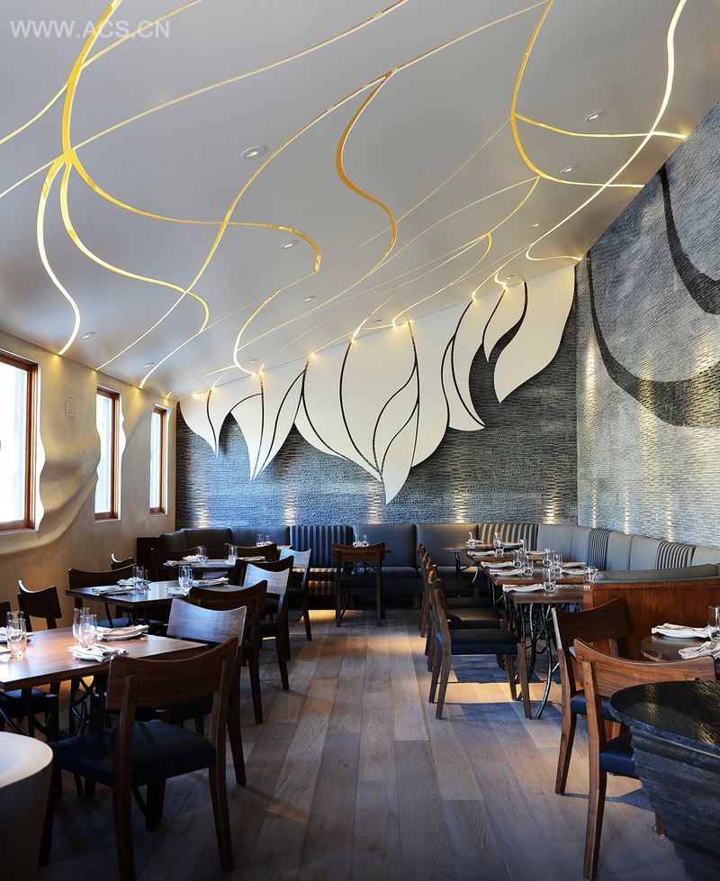 整体设计典雅、色调中和且材料天然,意指餐厅的农家新鲜美食和加州时蔬。为了让整个空间清新而亲切,我们采用了柔和色彩:白色和灰色。主餐厅和酒吧(休息区),地面铺上水洗橡木地板,从地板延伸至吧顶的炭灰色钢筋条变换着形式,与地板形成对比。外观设计低调而不失性感,黑焦炭木覆盖其身,有一种木炭做饭的味道。