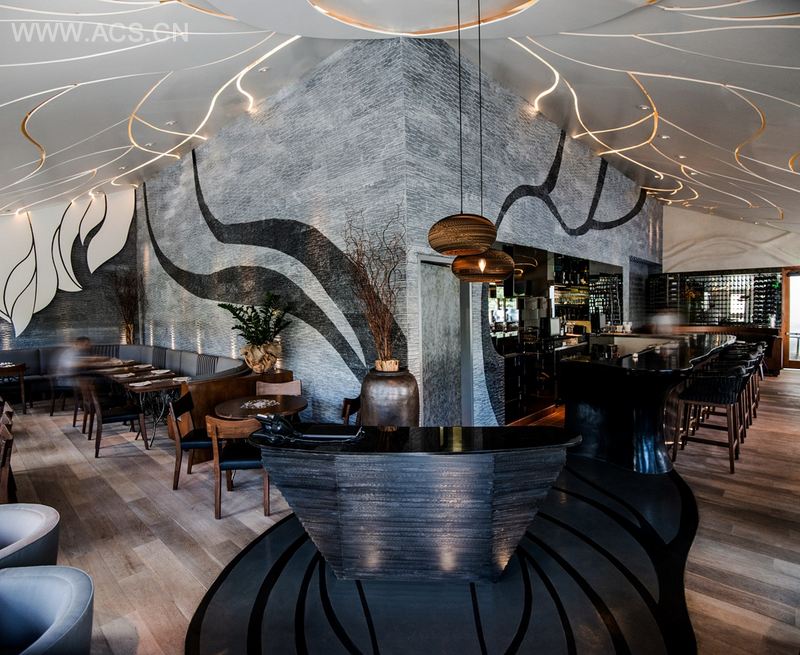 有机纸吊灯挂在主持台顶部,订制酒窖主导了主用餐台,白色大理石鸡尾酒台和舒适的沙发,吸引着顾客进入休息室,俯瞰庭院风光。