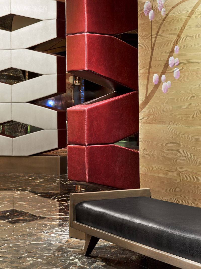 凯撒宫内的诺布餐厅是全世界最大的诺布餐厅。餐厅的设计理念,是受日本Wabi Sabi理念的启发:简洁的设计审美,意想不到的自然状态中的短暂与美感,令人回味无穷。酒吧和酒廊铺有手工凿刻的黑丘德达帕石材地板,空间内放置着Donghia面料的订制沙发和以绿色大理石为台面的餐桌。26席酒吧朝向休息室中央区域,特制的曲线木条让人不由地联想到手工雕刻的木碗。