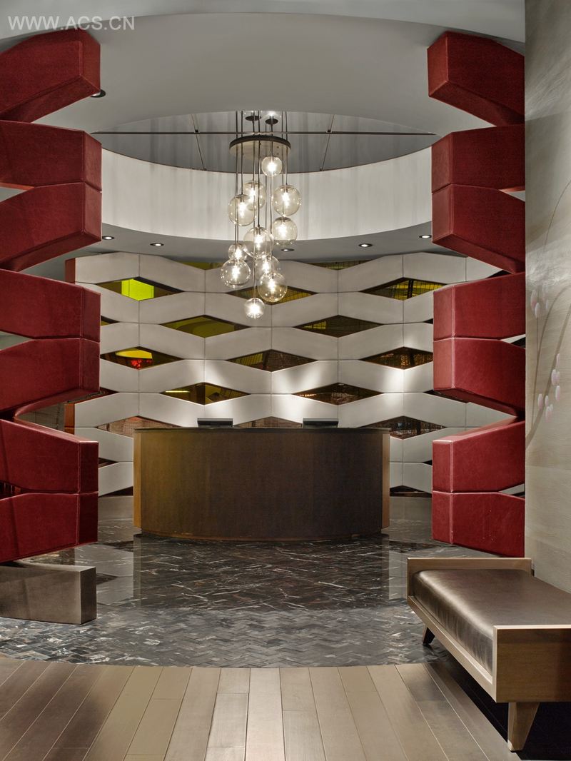 诺布酒店的大堂内部由木材覆盖,营造出一种单一、简洁却很生动的姿态,定义了整个空间。墙壁和天花板是以冷杉、铁杉和橡树木条打造而成,木条的形状、大小和颜色也各不相同。从地板到天花板,整面墙壁设有背光玛瑙面板。地板上铺满了端纹木方块。订制的接待台呈卵石状,并用亮黑高漆器装饰着。专用电梯采用了古铜门,电梯直通客房。同大厅一样,电梯的内壁和天花板都用特制木块覆盖。
