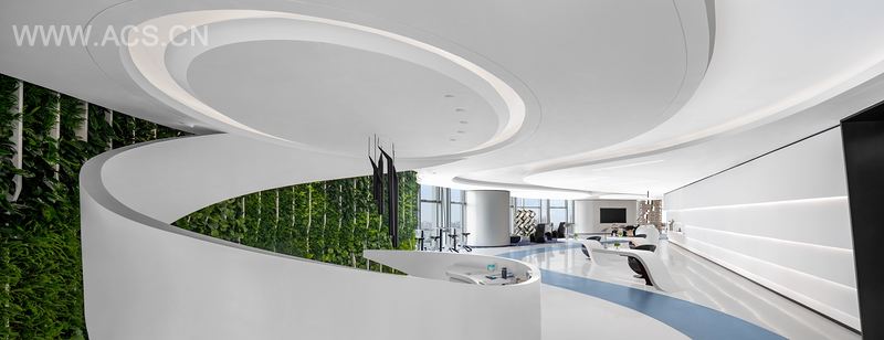 室內空間,雖然它悄無聲息,在承載著人的活動與夢想後,它被賦予了能量,形成自己獨特的氣場,人與空間相互補充、彼此鼓舞。本項目,我們提出了把“生命力”和“未来概念”作为其功能設計的参考和交汇点进行设计。接待區以環形飄帶造型打造,展現飄揚而起的動態,以包容、溫潤的方式接納著每一位來訪者,傳遞著遠洋集團生生不息、雋永深長的含義。墻面嵌入大塊的植物綠墻,承載蓬勃生機的迸發力。這個想法反映了我們發自內心的需要:重新獲得使公共空間更生態的可能。它表達了我們作為設計師的責任,新時代的生產與活動,不能再忽略發展對生態的破壞而進行。在空间色彩方面,将整个空间调整为统一的颜色,模糊时间和空间的界限,定义空间的延伸感。在辦公空間走動時,墻壁被弧形拱門分割,形成秩序感,並圍繞一個向內看的區域通過拱形的空間開口形成視覺滲透。太空艙內的艙門造型,秉承高科技企業的時代感,起到過渡的作用,配合柔光燈帶,賦予空間呼吸感,具有讓人在精神上獲取飽滿力量的能力。工作台模擬植物根莖向上生長之勢,由地面拔地而起,形成特色的工作面,连接起用戶對健康、休閒、社交、舒適的四大述求。未來,我們的設計也將圍繞建設互聯網+創新示範辦公展開。