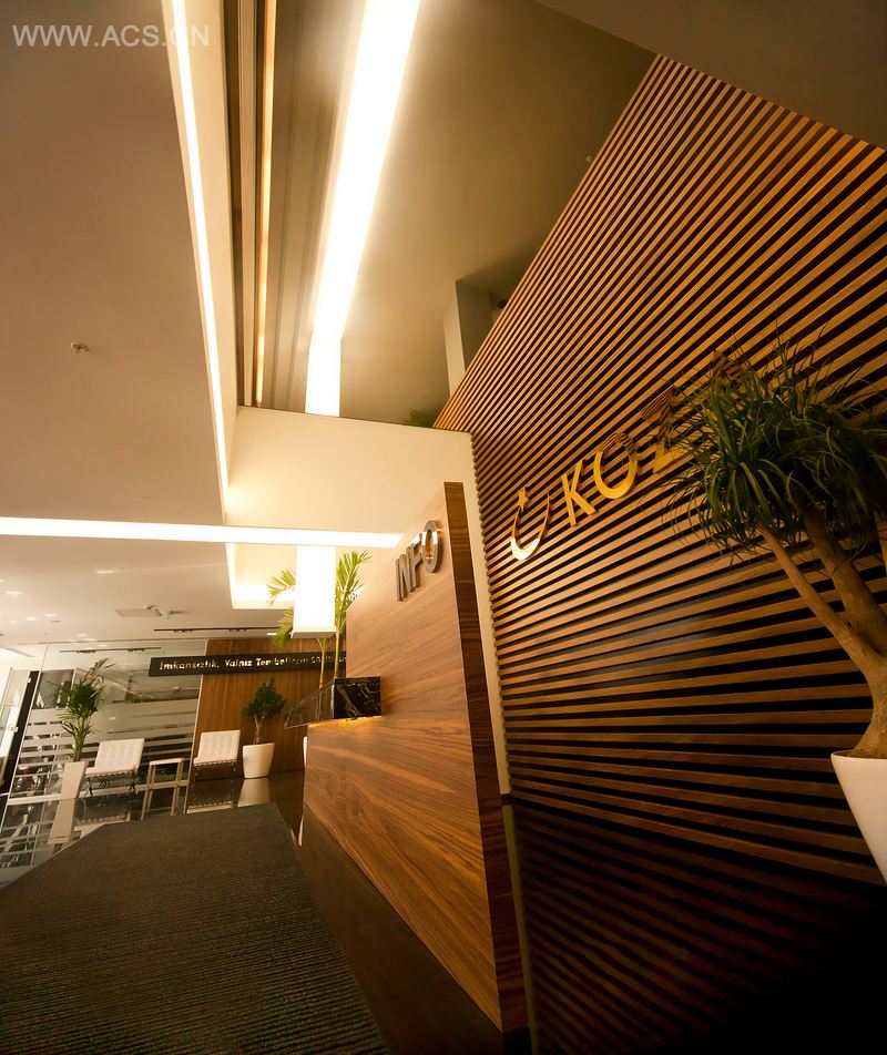 考虑到公司的威望和身份,设计以入口处作为优先考虑,花岗岩和木板诠释现代空间,配以一张大型接待桌。