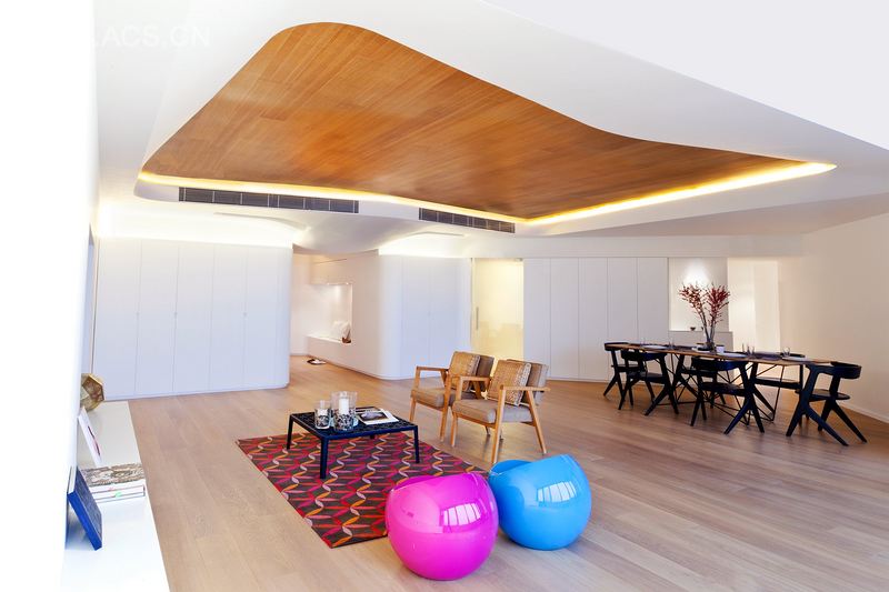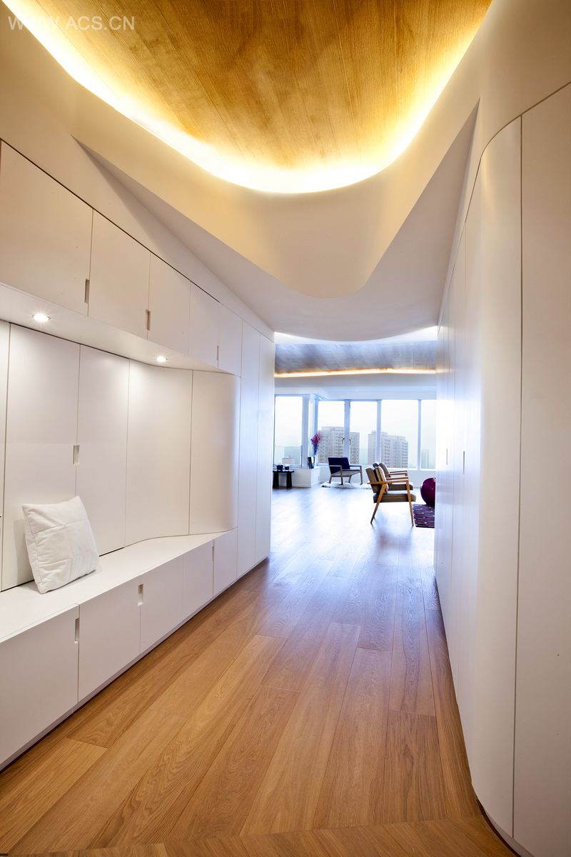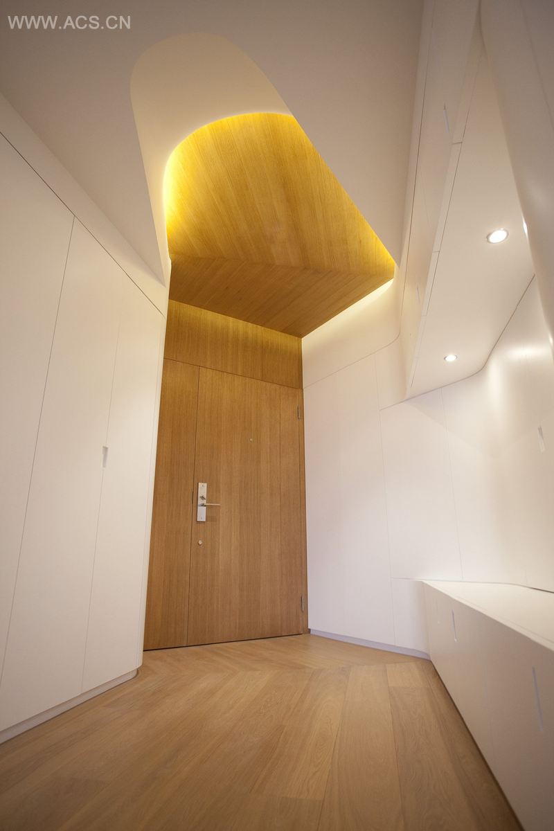 木头和石膏的少量使用将公寓的海拔往水平表面移动(尤其是墙),提高了天花板向外向上的推力。橱柜漆成白色,加厚,集中存储,娱乐系统和一体化长椅座位,三维立体的材料贯穿整个公寓。木头可以从地板,天花板旋转到厨房的墙面,马赛克瓷砖使浴室照明更加明亮。