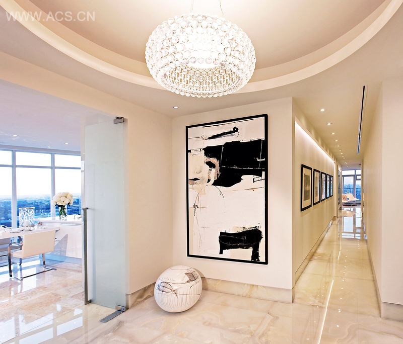 既不阻碍也不会与景色相冲突,起居室和客厅都配有简单的矮沙发和桌子,奶油色调的皮革和织物。内置矮书架和媒体墙为客厅提供了特殊功能。在主卧室,一张大床摆在中央,宽敞的床头板墙选用白色高光漆,创建一条走廊通往豪华的情侣浴室。II BY IV小组选用有趣的艺术品,包括黑白摄影,强烈变形墙和地板雕塑、绘画和素描。