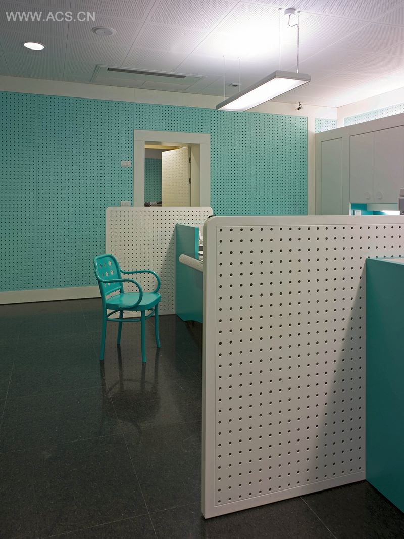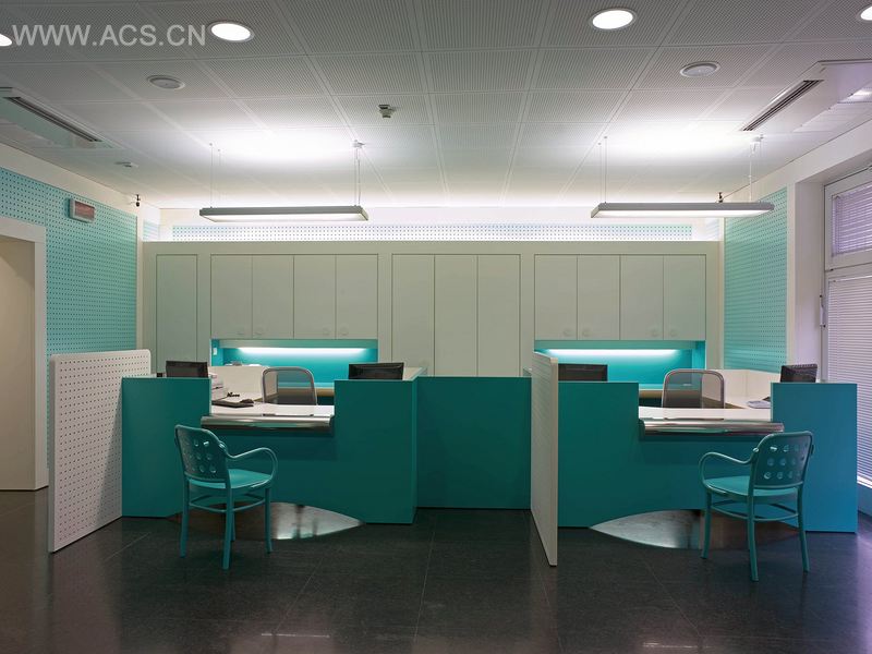 本案是对Collesalvetti历史中心的一栋建筑进行翻新,使其成为Banca del Credito Cooperativo di Castagneto Carducci银行分行。主立面没有改动,所以只能通过窗户上的招牌或标志识别银行。功能分区方面,银行分为两层,底层设有柜台、管理处、秘书办公室和小型存款处;档案馆和存款处设在地下层。大厅墙壁、管理处和秘书办公室周边均覆盖Locatelli穿孔木质饰面,涂以淡蓝色,并衬以白色边框。
