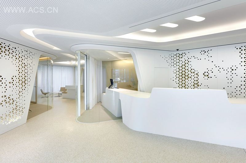 优雅的流线型墙壁连通着银行的各区域,从前方的顾客接待区至朝向庭院的员工工作站。墙体本身充当薄膜媒介,将开放的公共空间与私密的会议室区分开来。墙壁呈现过往著名户主的肖像,比如Boklin、Semper或Sypri。抽象的画像经先进的数字化处理,形成墙面印花。尽管装饰复杂,设计却以银行所处的地域文化为基础,并面向未来进行规划。