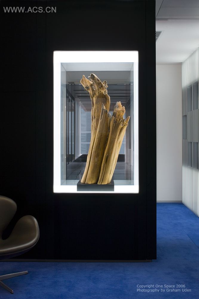 设计旨在满足业主的要求,即设计功能性高的交易大厅,附设会议室,并有陈列台展示业主的亚洲陶瓷收藏。两大主题之间的动态联系,激发了设计团队的想象力,得到一个奇异的、主导的造型,贯穿于整个空间——独立式的、达到博物馆质量的展示墙,以抛光和亚光黑色不锈钢玻璃呈现。
