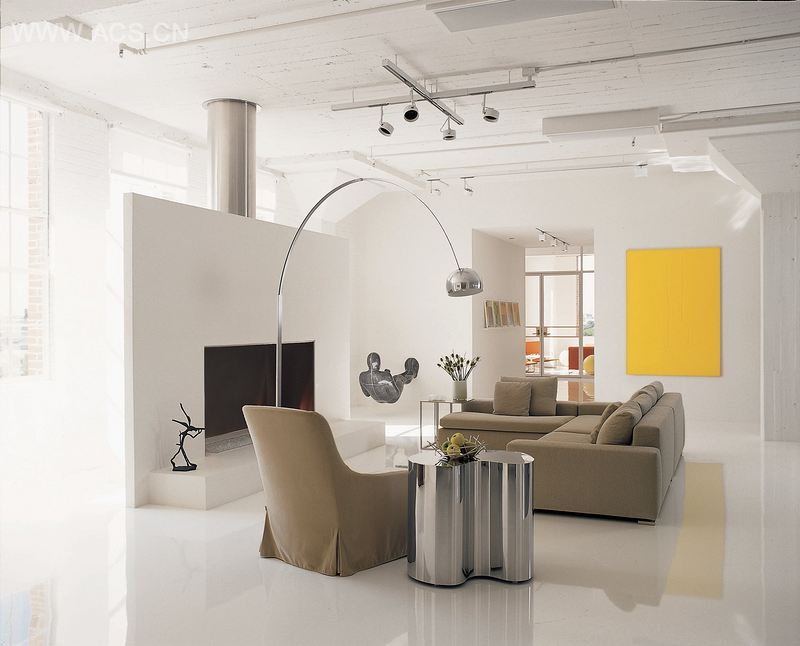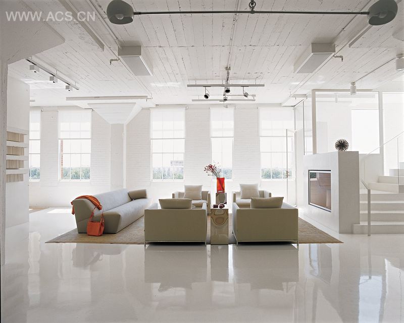 该项目是为一个艺术收藏家而设计,这个阁楼占据了圣安东尼奥市中心一个旧工厂最上面两层。项目中新、旧结构都被涂成了白色,强调了原有的砖石与新砌成的墙壁上的板状混凝土、明亮的环氧树脂地板和涂漆的橱柜之间的对比。