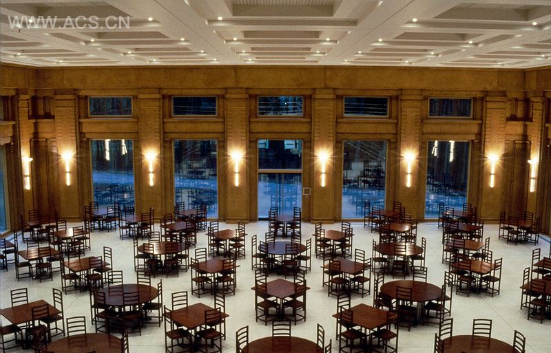该建筑被扩建为银行的总部办公室,位于布鲁塞尔郊外的La Hulpe,地处一块树木繁茂的区域。经初步研究,设计师决定不改动中央公园,而将建筑选址在区域的最高地段,以保证建筑与当地景观的融入性。基于同样的考虑,建筑沿水平方向进行开发,三层地上,两层地下。建筑结构包括两翼,由中央区域连接。中庭有着透明的屋顶,双层玻璃立面保证了充足的光线,并有意制造不协调感。餐厅和咖啡厅位于凉亭区,以玻璃走廊连接主楼。本案是第一项结合混凝土、钢铁和玻璃等不同技术的工程。项目包括办公室、餐厅、音乐厅、停车场和家具及照明设计。