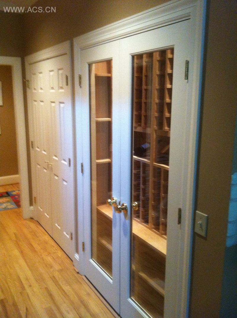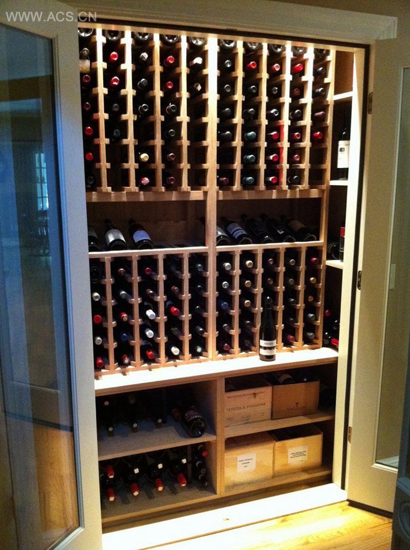这个酒窖的设计颇具挑战性:有温度控制、现有的储藏室可容纳200瓶酒、55英尺宽、19英尺深、 既要有储存区又要有红酒展示区。储藏室设在一条走廊里,通往一个有着美丽的白橡木地板的大型开放式厨房。为了与厨房和重新打造的储藏室相照应,酒窖的墙壁和酒架都使用了白橡木。展示区覆盖了一个橡木架,不仅在门口上提供了储藏区,还起到了隐藏冷却器和照明装置的作用。排架并入到两边的货架,使客户的新酒能够竖立放置。结实的储藏室门换成了定制的玻璃法式门,一眼就能够看到整个富有的、高雅的酒窖。