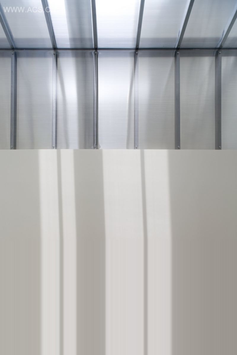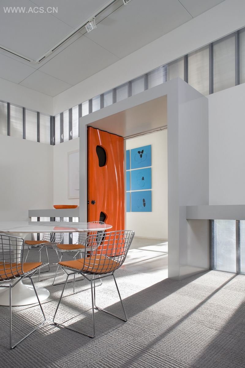 在室内,天窗给开放的空间带来充足的自然光,高大的墙面可以承载大件艺术品,而会议室的门就像一件令人印象深刻的雕塑作品。